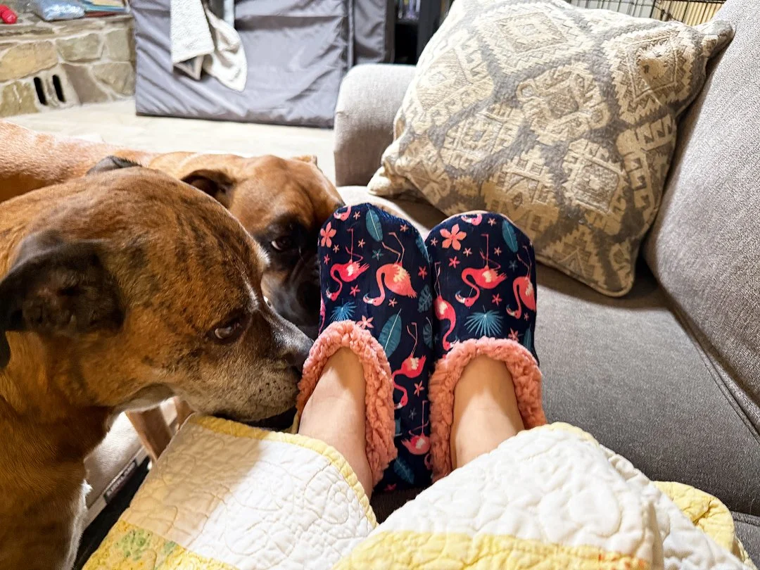 Afternoon sunlight and a spring breeze streams through our screen door that opens to the backyard. I can hear a few birds chirping on this blue-sky day as my dog Hercules, laying on a giant pillow on the floor me, randomly wags his tail while dreaming. My other dog, Katniss, stares at me from another giant pillow on the floor, her breathing a bit labored as she snores while awake. Stella, my cat, rests on the third giant pillow in the family room floor, her nose pointed toward the screen door as she sniffs fresh, Albuquerque air. I am on our couch in an L-shape, back rested on a couch arm and pillow with legs stretched out and holding my laptop and a yellow patchwork quilt my friends made some years go. My feet, underneath the blanket, are snuggled in flamingo slippers that arrived yesterday; they were a present from a friend who wished me congratulations for nearing the end of my radiation journey. When I slipped them on, the dogs took delight in sniffing them thoroughly.