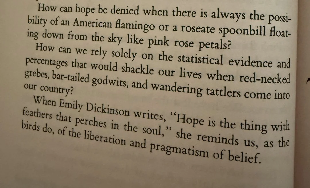 My toenails have been pink throughout the entirely of treatments. I got a gel pedicure in February before my radiation appointments began and its held up nicely. I want to be clear though that even though my toes are Barbie pink, they were meant to be flamingo pink, and absolutely NOT breast cancer pink. I wanted flamingo pink because about a week after my surgery, my mom came to visit and we went to the zoo to get out of the house. At the Albuquerque Zoo, visitors are greeted with a flamingo habitat upon entry and the flamingoes looked soooo pretty that day! I was immediately awed and happy, and that moment has stayed with me since. A poet I love, Andrea Gibson, wrote: “Awe is the most powerful medicine in the world.” Flamingoes with my mom provided that medicine for me in January. Later, I read the following quote in a book called “Refuge” by Terry Tempest Williams. “Refuge” is a beautiful memoir about Williams’ experience as her mother navigated breast cancer, and I loved this bit about statistics, flamingoes, and hope. Apparently, some decades ago, a flamingo ended up in the middle of Utah and no one knew why or how.