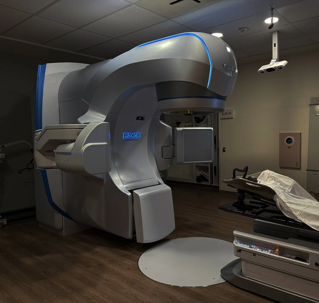 When it’s my turn, the technician and I walk a short, beige-colored hallway and turn left into a dim, blue-lit, Star-Trek looking room that has the giant radiation machine in the center. Even though the machine is used daily right now, in 2026, it looks to me like something from the future. Computer monitors line one of the walls, displaying scan images, numbers, and grids. The radiation machine is shaped sort of like a giant sewing machine with a rotating arm and laser lights. My body lays on a table beneath the rotating arm as if I’ve been placed where fabric would move through, but I must stay completely still. The arm above me, rather than holding a needle, has a flat, square window where an image of my chest is reflected above me. I’m not sure what types of fancy technology and cameras are behind that window.